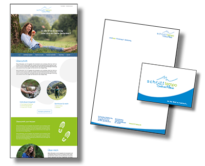 Für diese Geschäftsidee galt es, einen passenden Firmennamen zu finden. Mit „Schritt-Tempo“ hatten wir ihn im Zuge des „Starke-Marke!“- Coachings gefunden. Diesen setzten wir im Design des Logos und der Geschäftsausstattung um. Mit der Gestaltung von Design und Texten der Website wuchs ihre Geschäftsidee für Sabine Kleene zu einem großen Ganzen, in dem sie sich voll und ganz wiederfand.